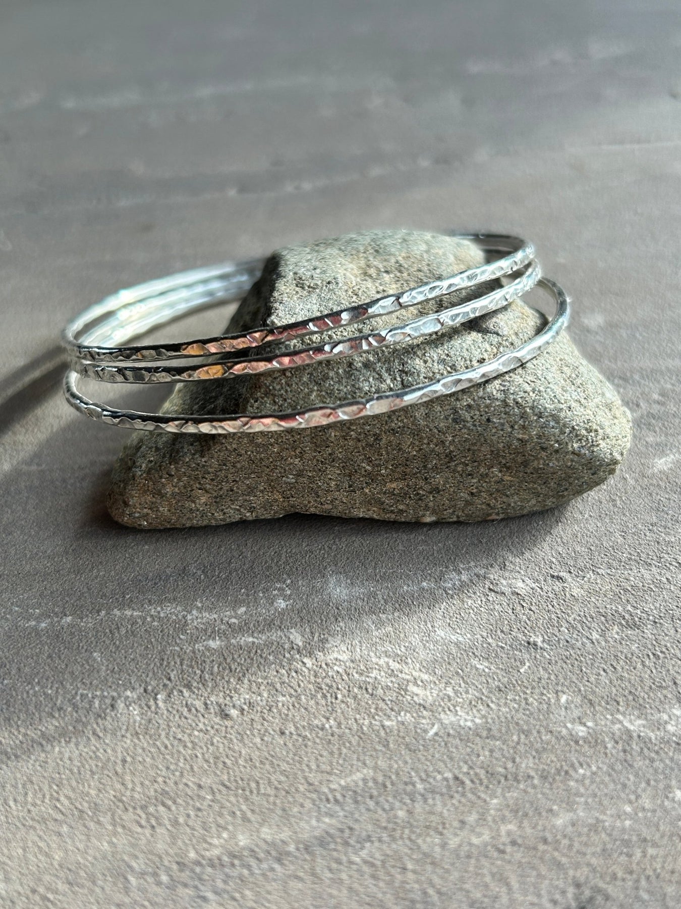 Save money when you purchase three bangles together! The slimmest version of the Classic Bangles made from solid Sterling Silver with a hammered finish, looks great in triplicate so why not treat yourself.