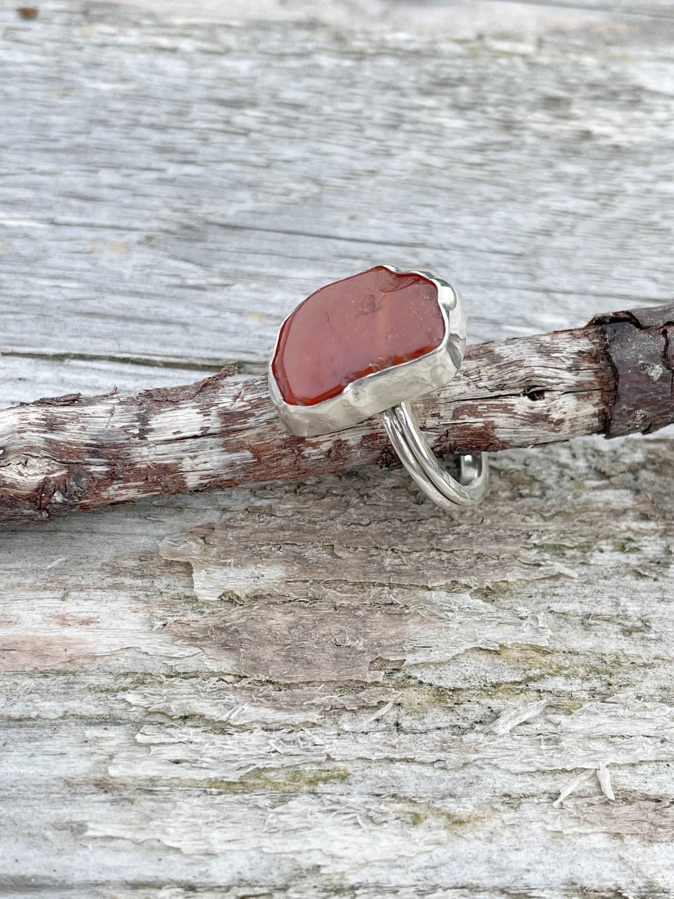 A stunning statement ring which packs a punch. The stone is set in a handmade Sterling Silver bezel on a 4mm wide band. This ring looks awesome when paired with one of our grooved hammered band or Interlocking band.
