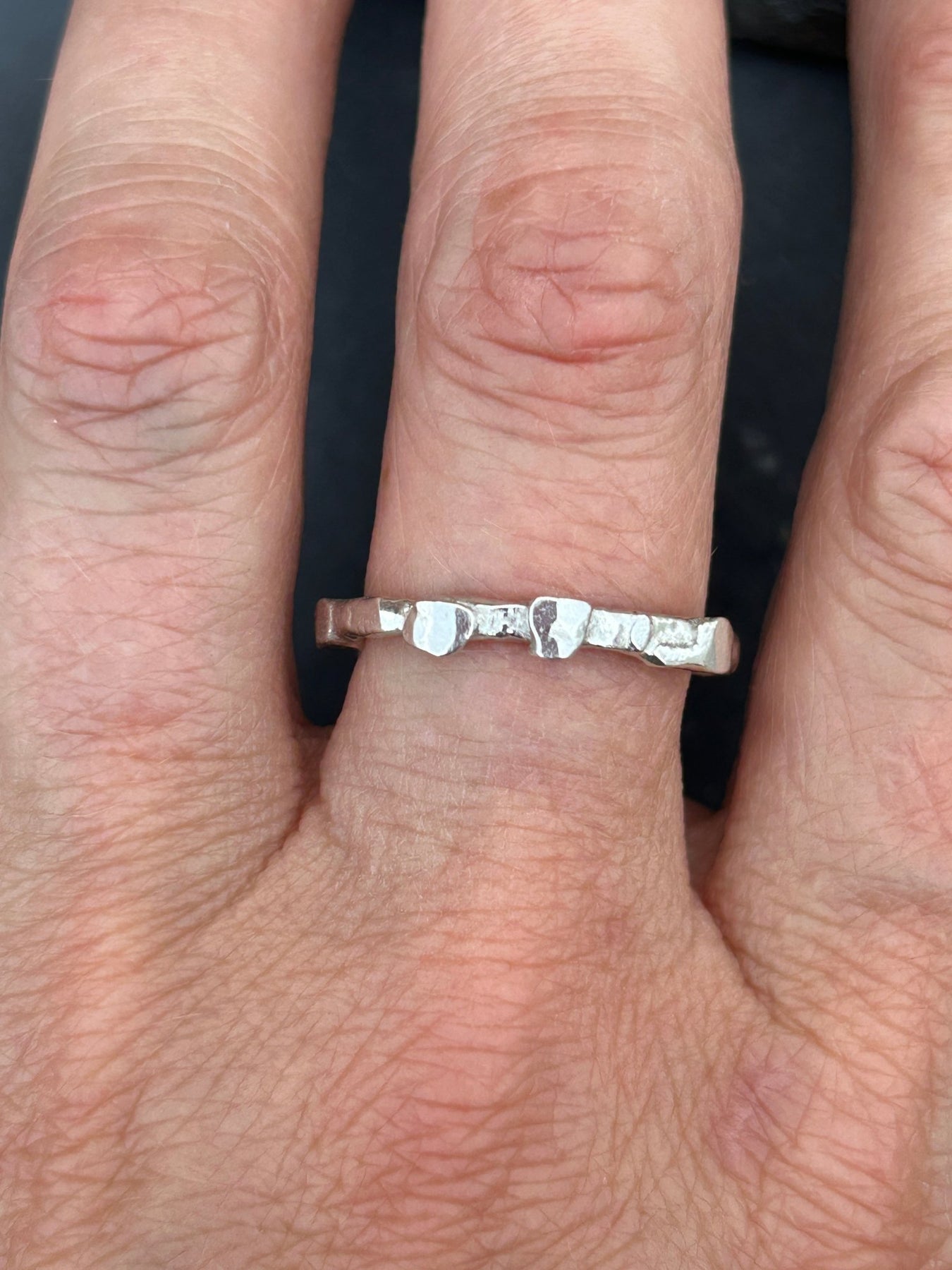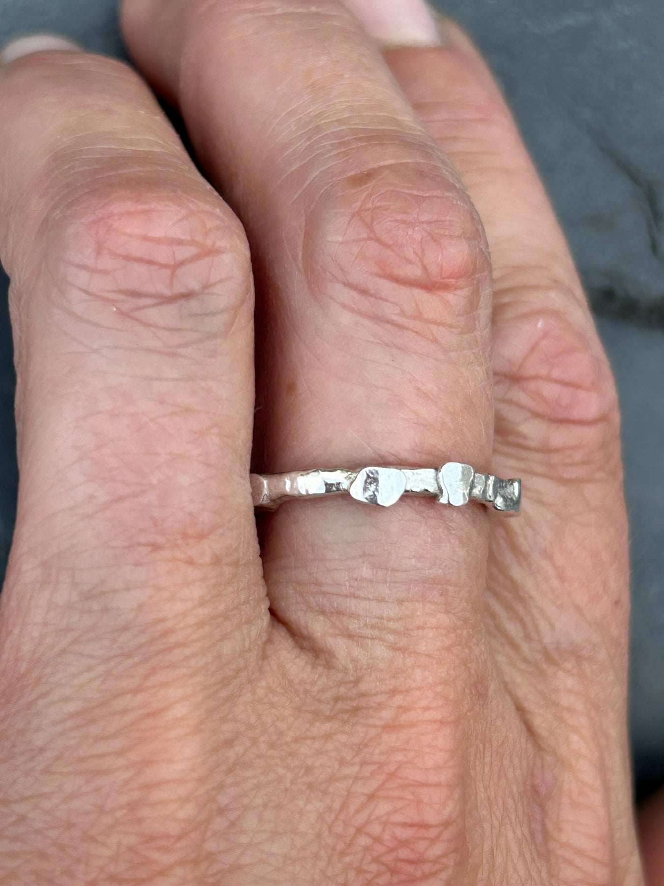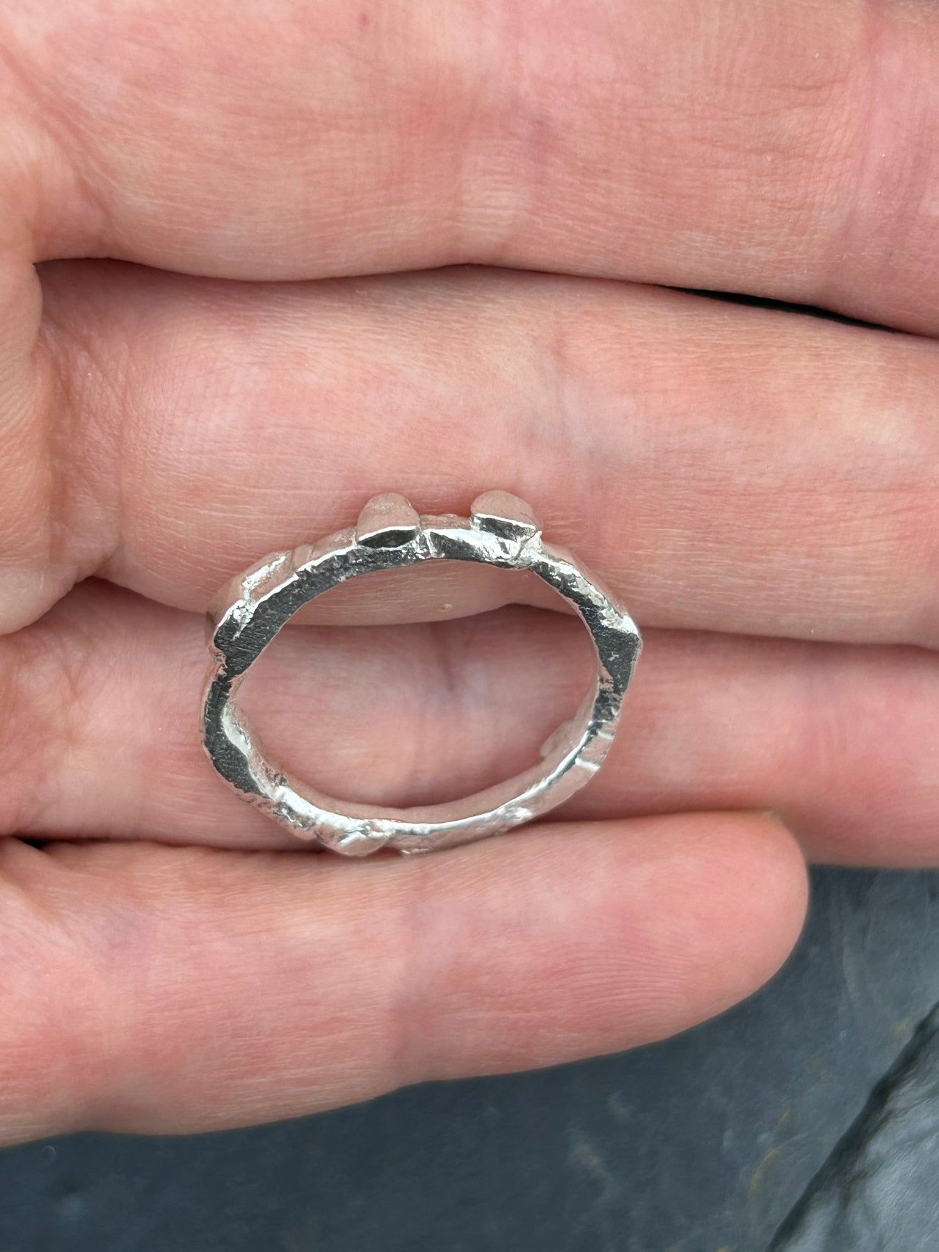 A solid Sterling Silver ring on a molten textured band and set with small molten silver pebbles around the band. Made from 100% recycled Sterling Silver, molten and shaped by hand.