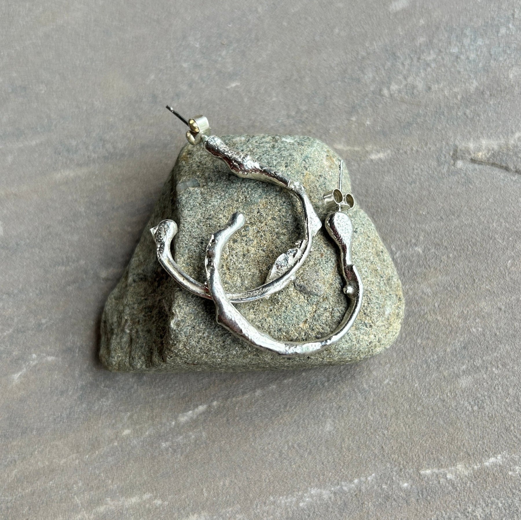 These hoop earrings are made from molten Sterling Silver which has been formed into shape. They are beautifully organic in form and texture and each pair is unique.