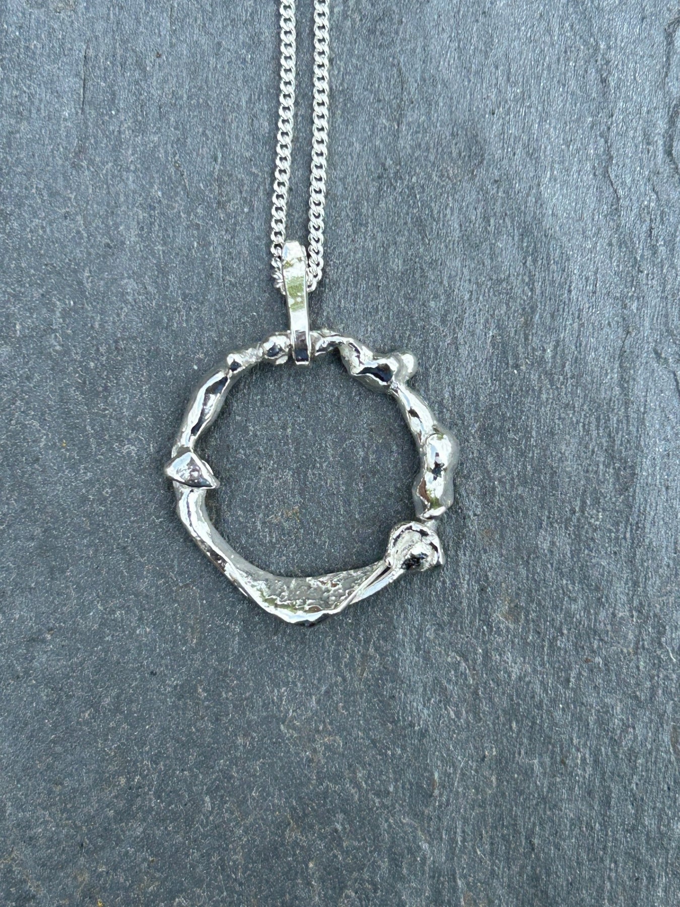 This pendant is made from 100% recycled Sterling Silver, molten and shaped by hand to represent the circle of harvest.