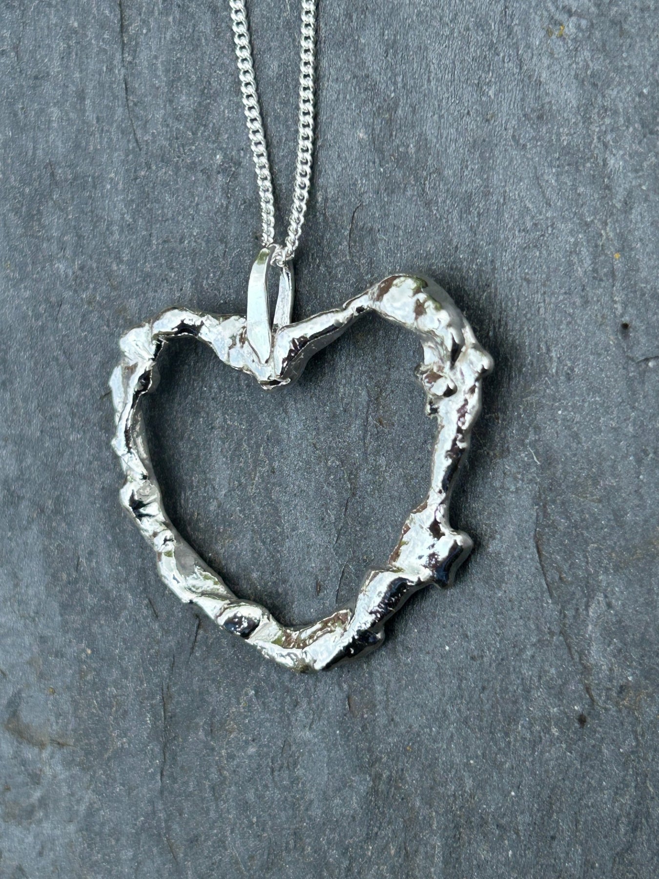 This large heart shaped pendant is made from 100% recycled Sterling Silver, molten and shaped by hand.