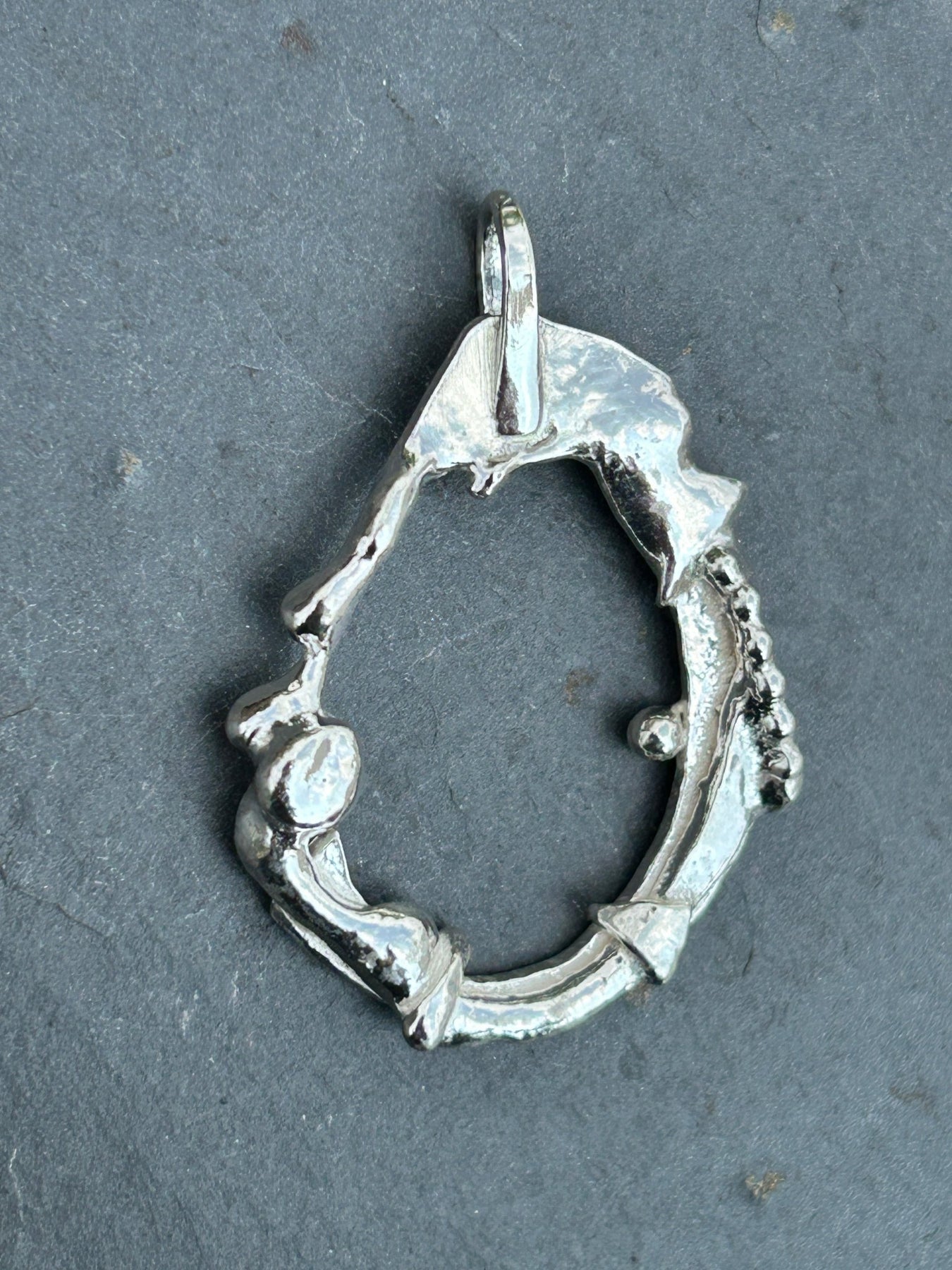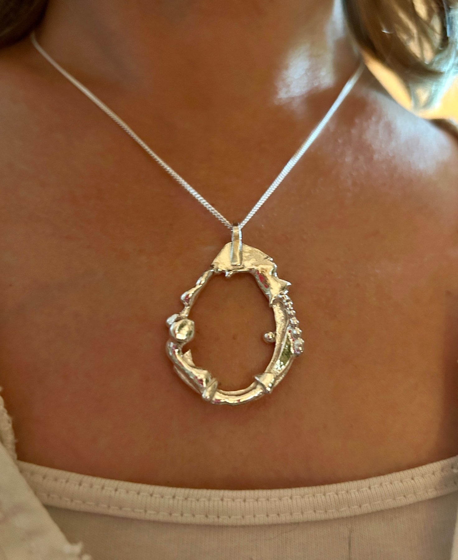This beautifully textured solid pendant is made from 100% recycled Sterling Silver, molten and shaped by hand to represent the Moon.