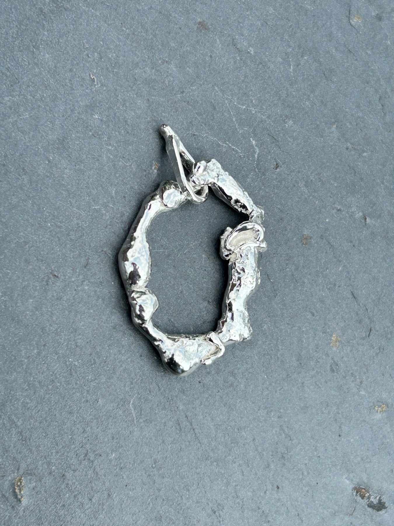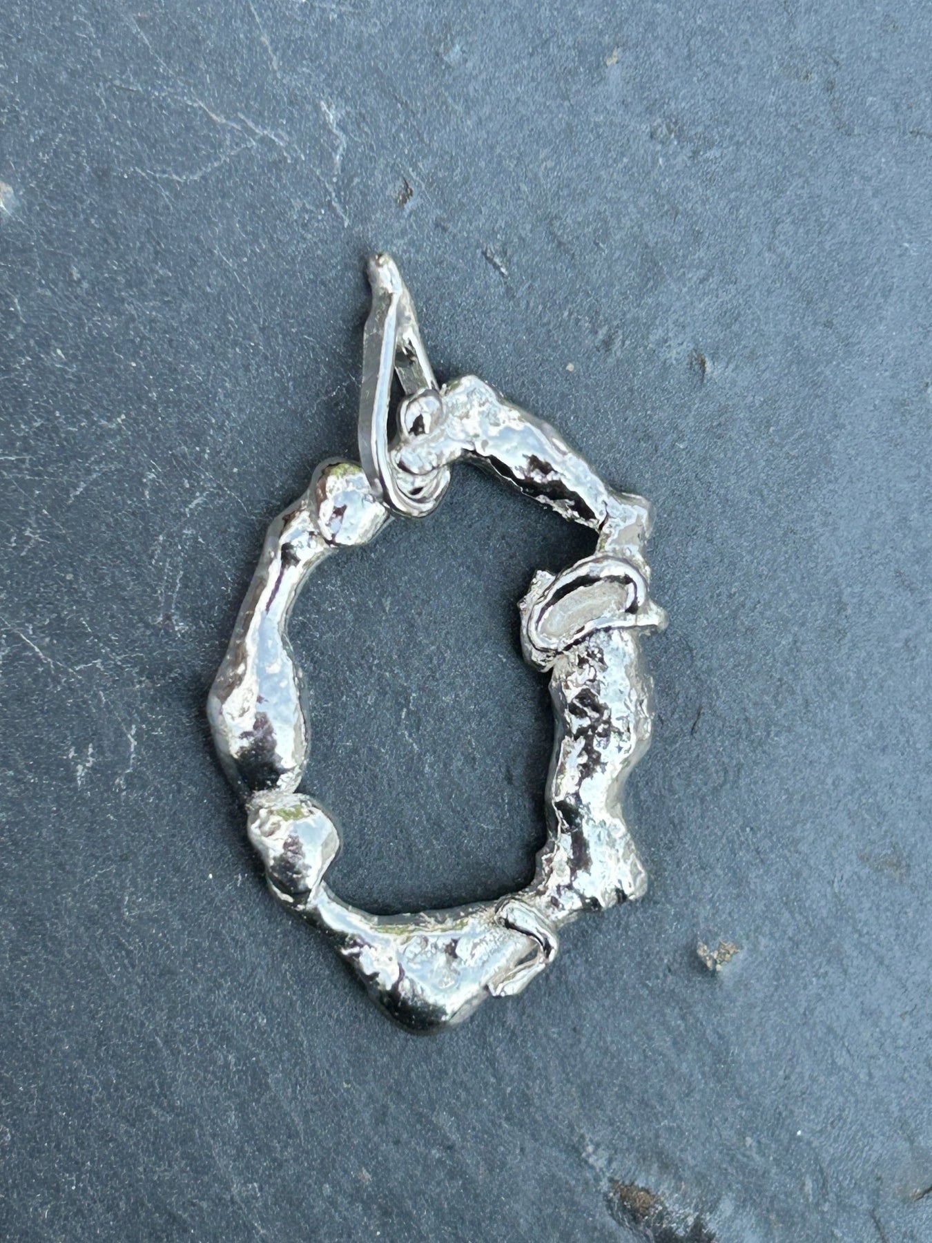 This pendant is made from 100% recycled Sterling Silver, molten and shaped by hand to represent the texture of a woodland path