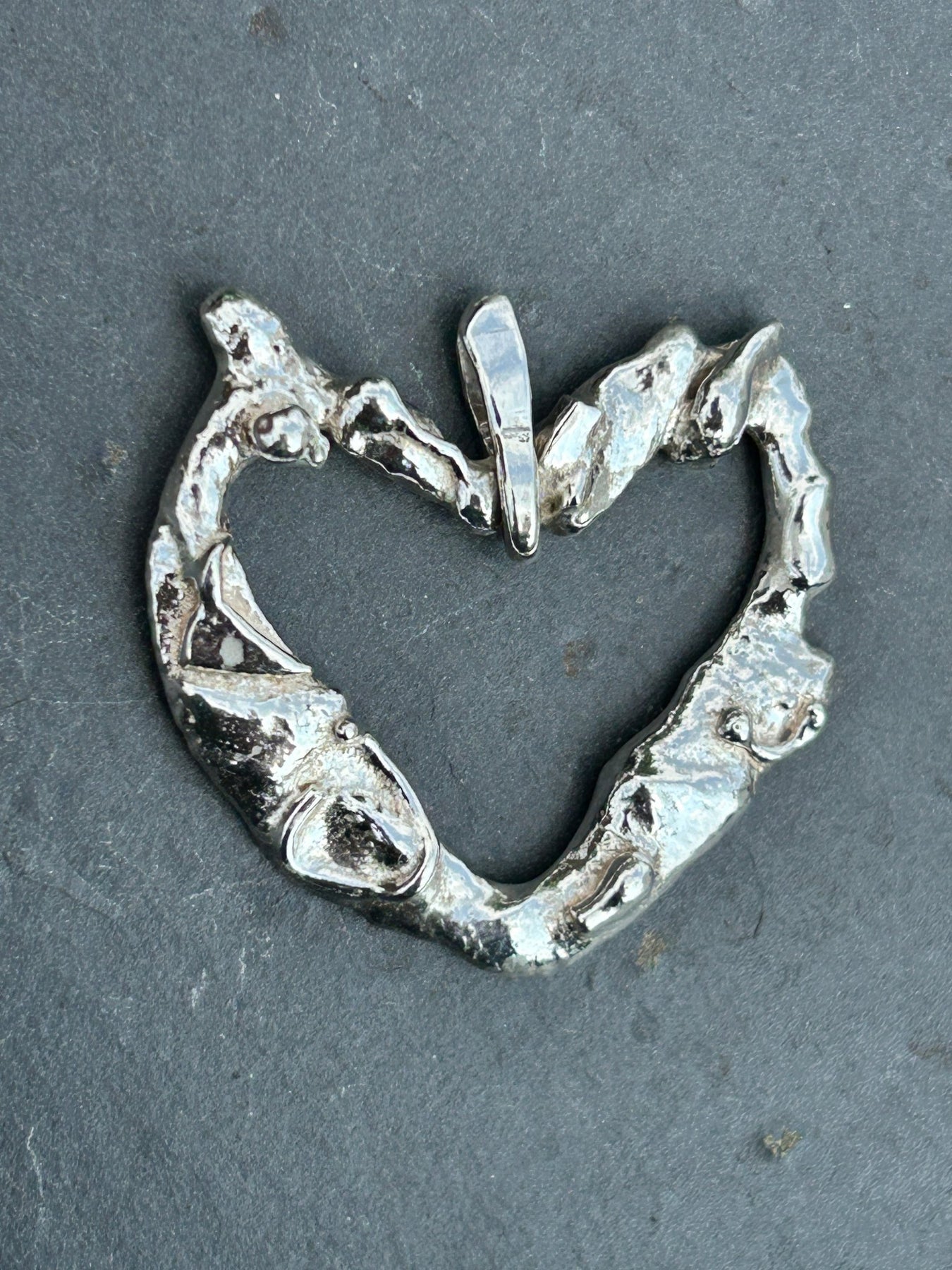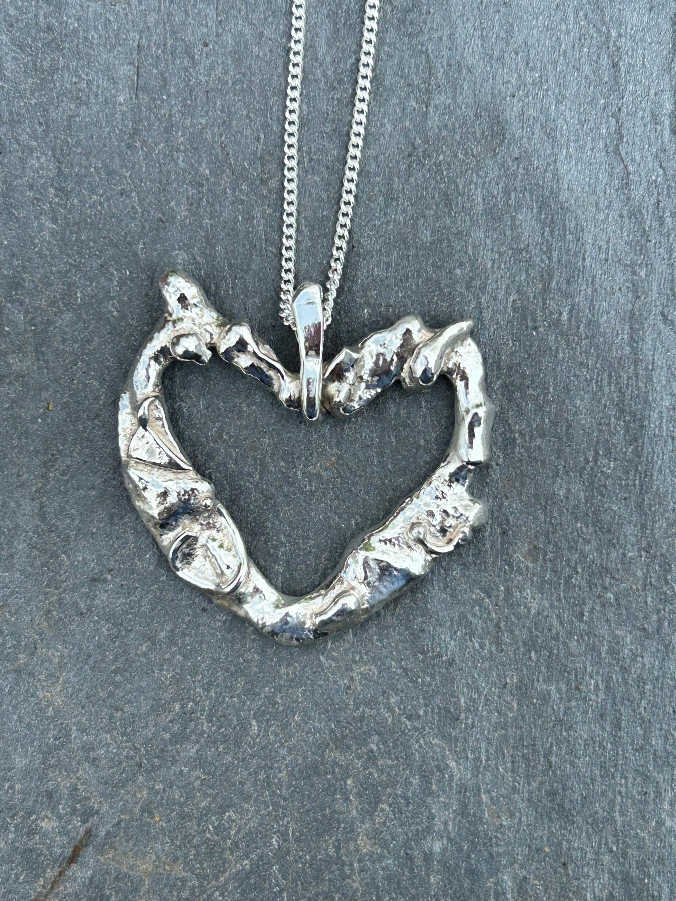 This beautifully textured heavier Heart shaped pendant is made from 100% recycled Sterling Silver, molten and shaped by hand.