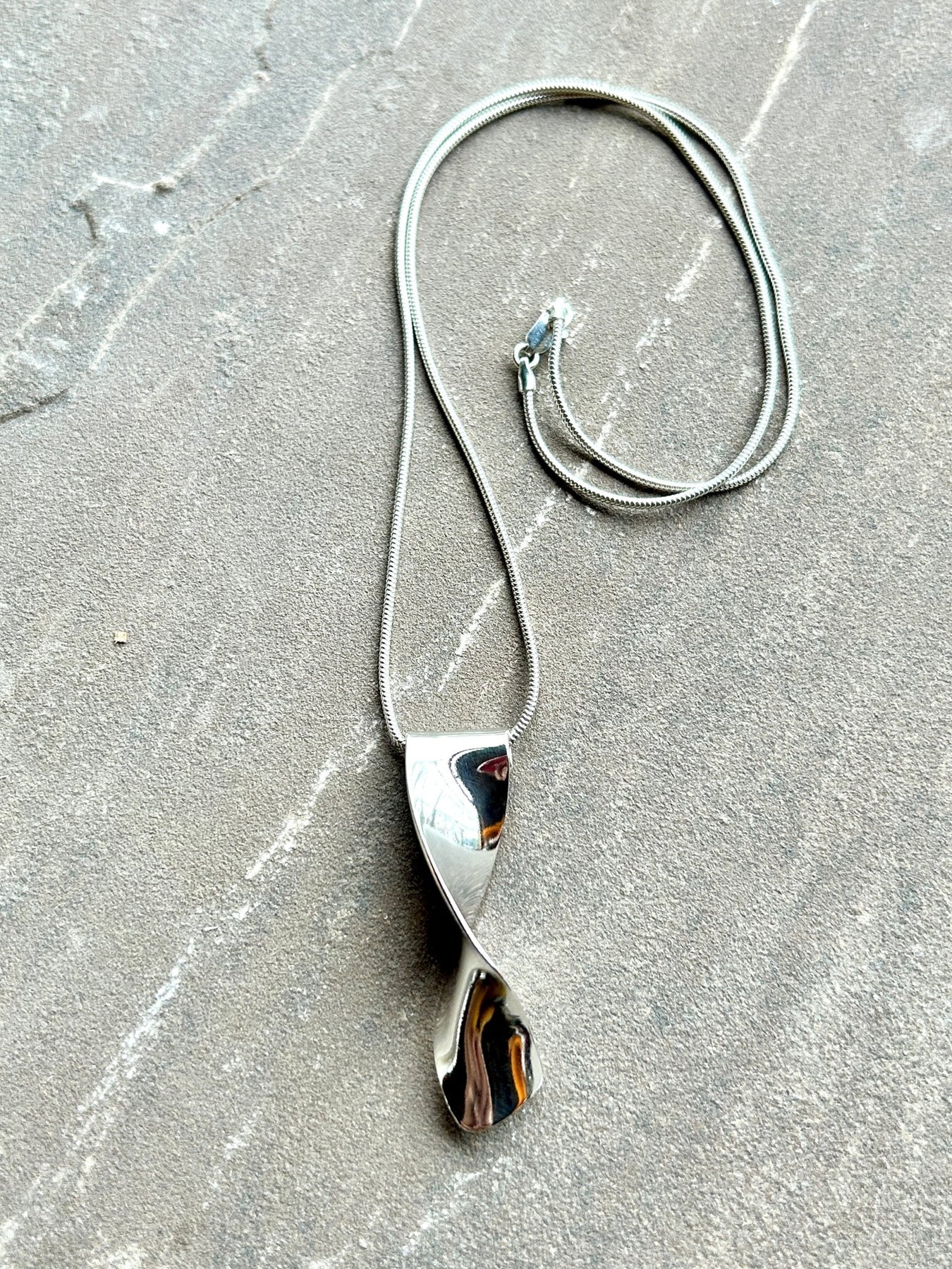 This beautiful pendant features a centre twist which catches the light whenever you move thanks to the highly polished finish. Handcrafted from Sterling Silver the pendant measures 10mm wide and 42mm long. Hung on a 1.2mm Sterling Silver Snake chain of varying lengths this is a simple but effective pendant.