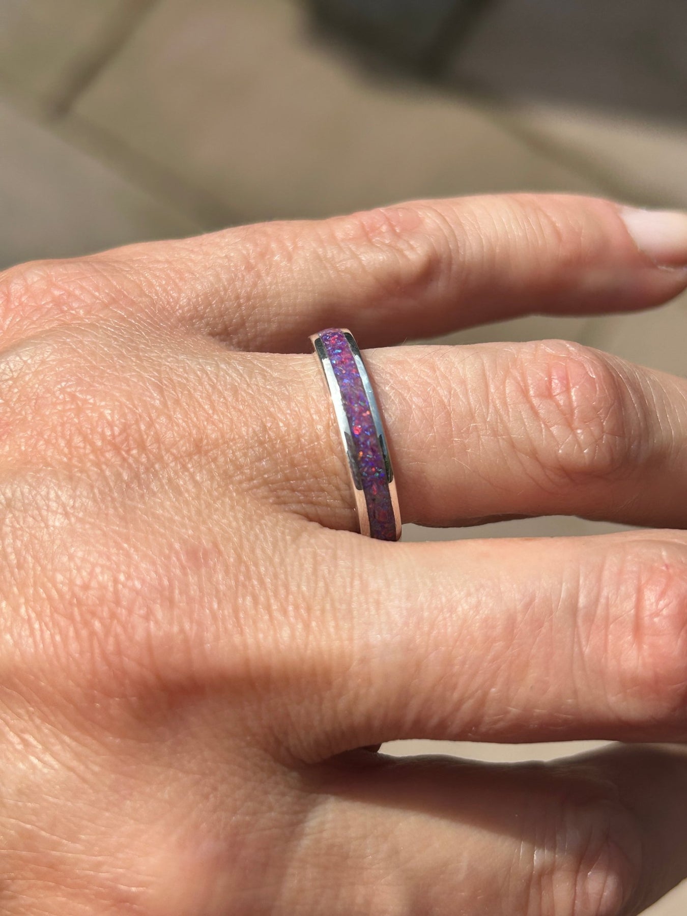 This particular design features a 4mm wide band with a 2mm strip of crushed opal framed neatly between two 1mm rails. The result is a bright, colourful band with a lovely shimmer that catches the light beautifully.
