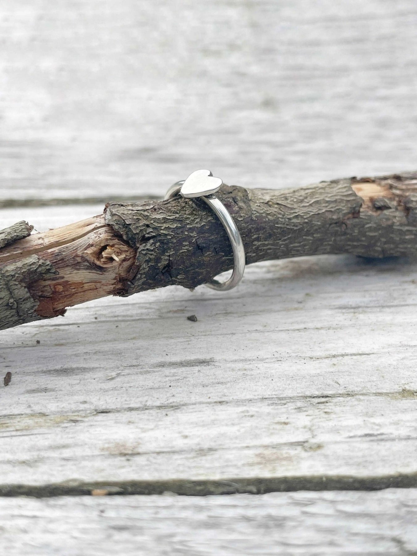 The Heart Stacking Ring is a beautifully delicate handmade ring with a 1.8mm polished Sterling Silver band and a hand sawn heart in either Sterling Silver or 9ct Gold.