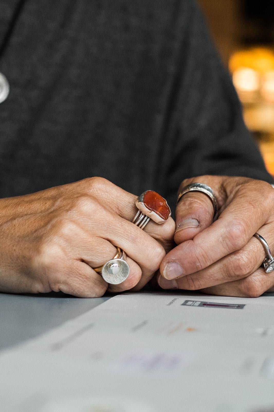 A stunning statement ring which packs a punch. The stone is set in a handmade Sterling Silver bezel on a 4mm wide band. This ring looks awesome when paired with one of our grooved hammered band or Interlocking band.