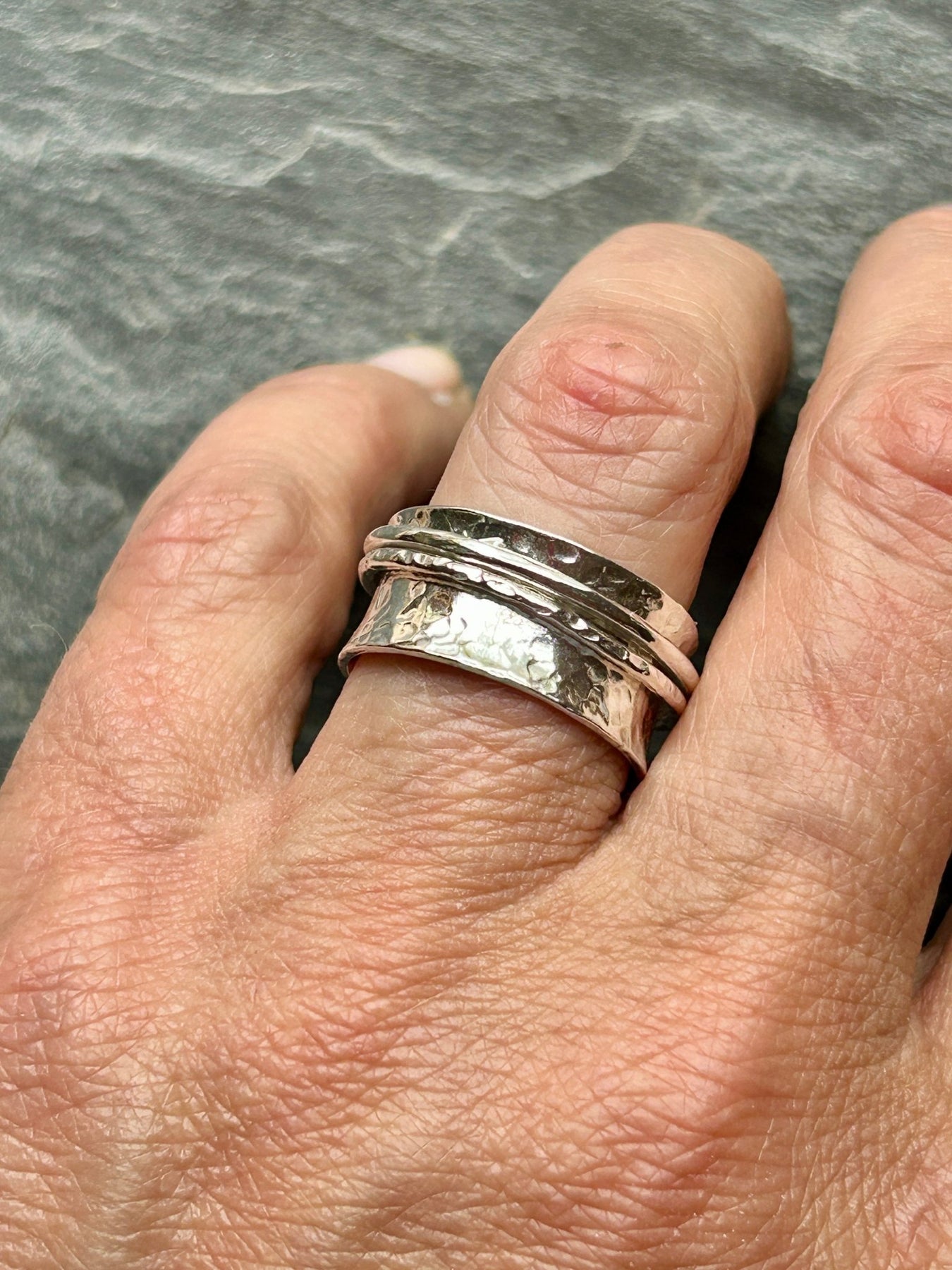 Each ring is handmade to order, so it fits perfectly and feels wonderful to wear. The smooth movement of the spinning bands offers a soothing distraction - perfect for moments of quiet focus or to simply keep restless fingers occupied.