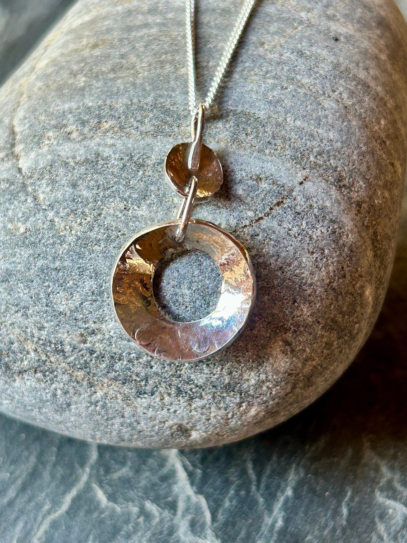 The Concave Pendant is a bold, sculptural piece crafted from 100% recycled Sterling Silver. Each pendant begins as a flat silver disc, which is then hammered, shaped, and gently domed by hand to create its distinctive concave form.