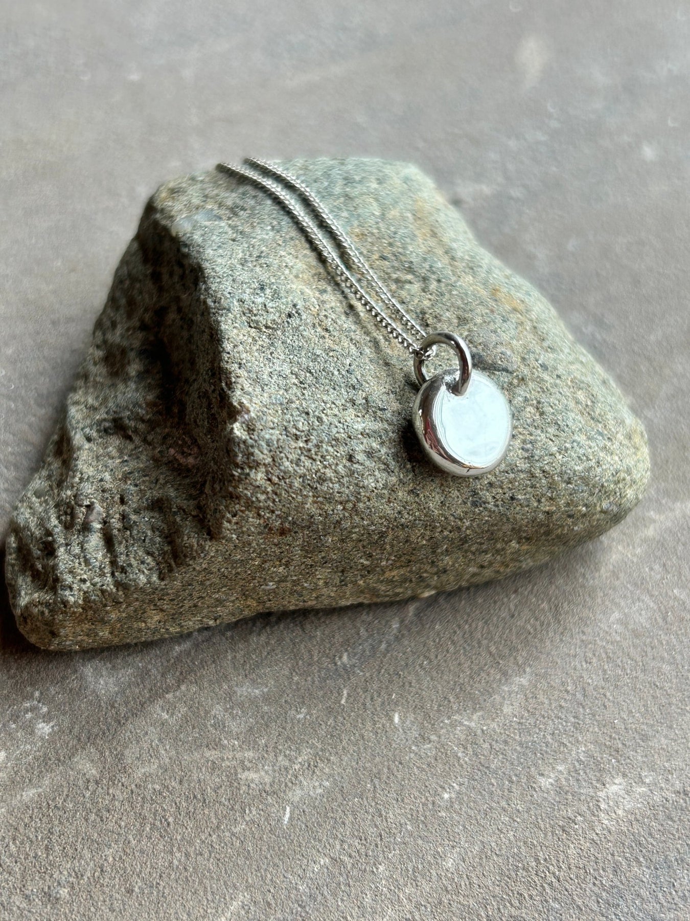 This polished Pebble Pendant is handcrafted from 100% recycled Sterling Silver. It measures 10mm across and is strung onto a fine Curb chain, just choose the length to suit your style.
